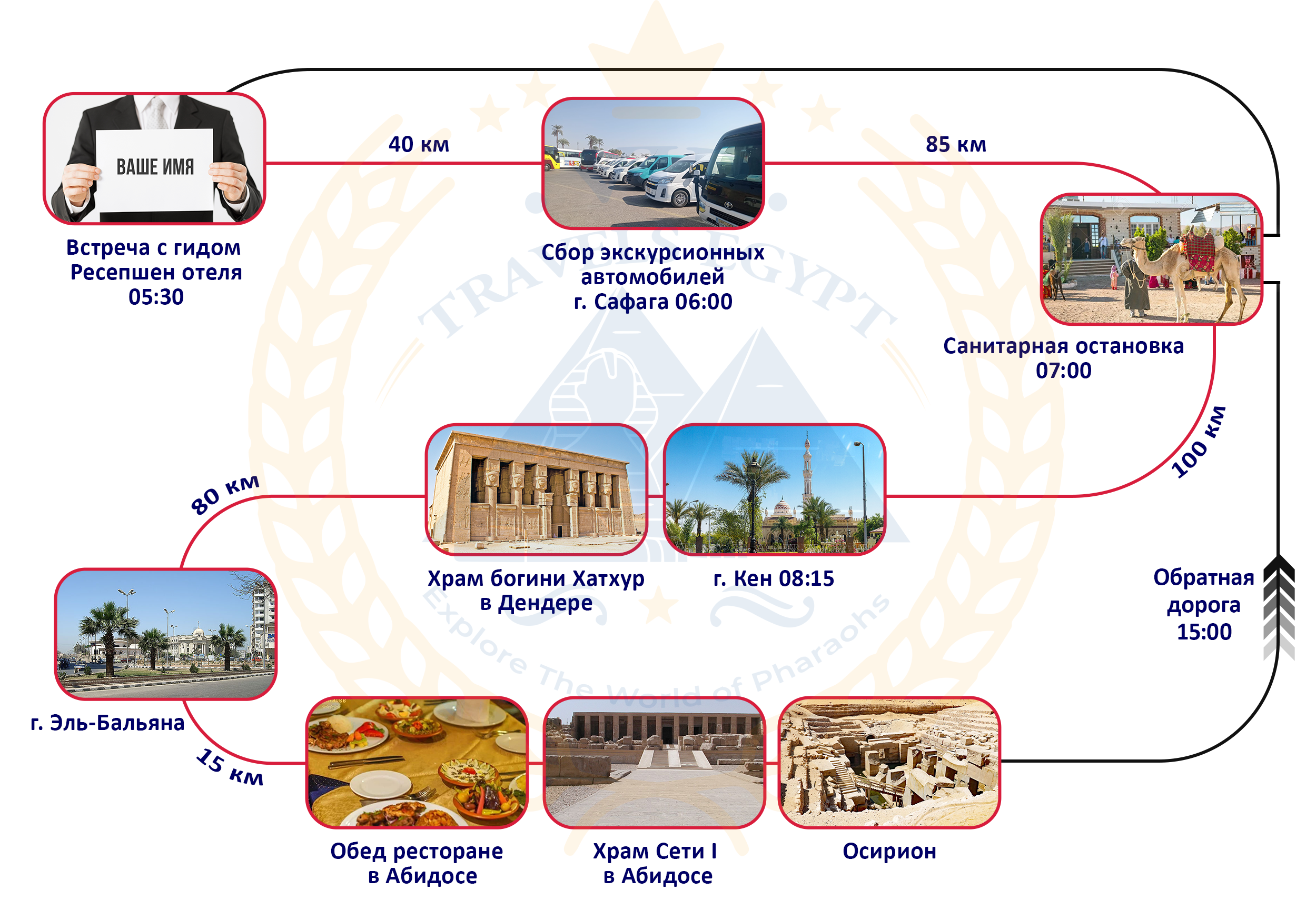 - Сначала посетим Абидосский комплекс храмов, затем отправимся обратно в Дендеру, где побываем в Храме богини Хатхор.