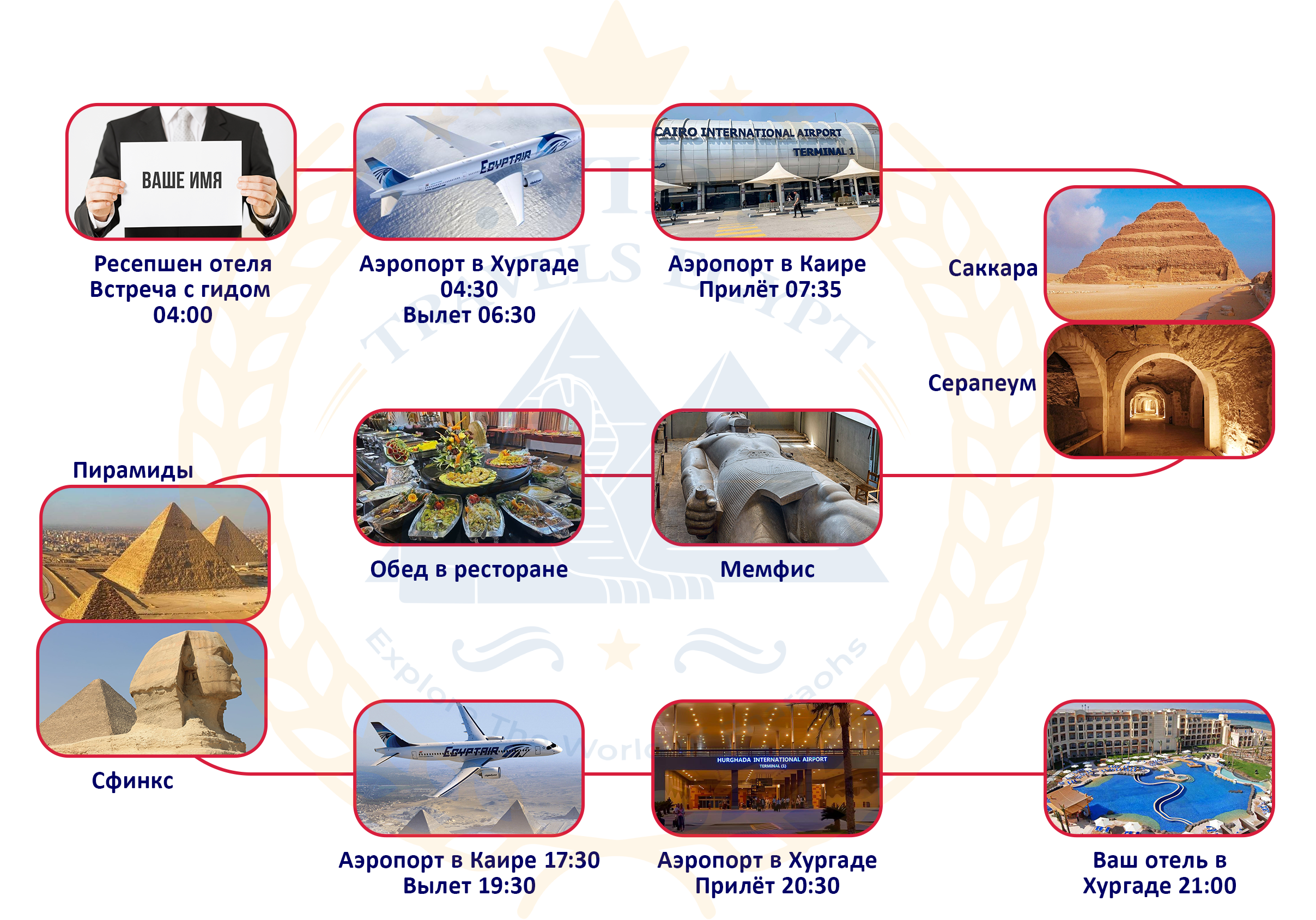 - Всего час полета — и вы в Каире. Там вас будет ждать профессиональный гид-египтолог, с которым вы проведете целый день, путешествуя на современном микроавтобусе с кондиционером. Вечером гид отвезет вас в аэропорт прямо к вашему рейсу. В Хургаде вас встретит представитель и доставит обратно в отель.
