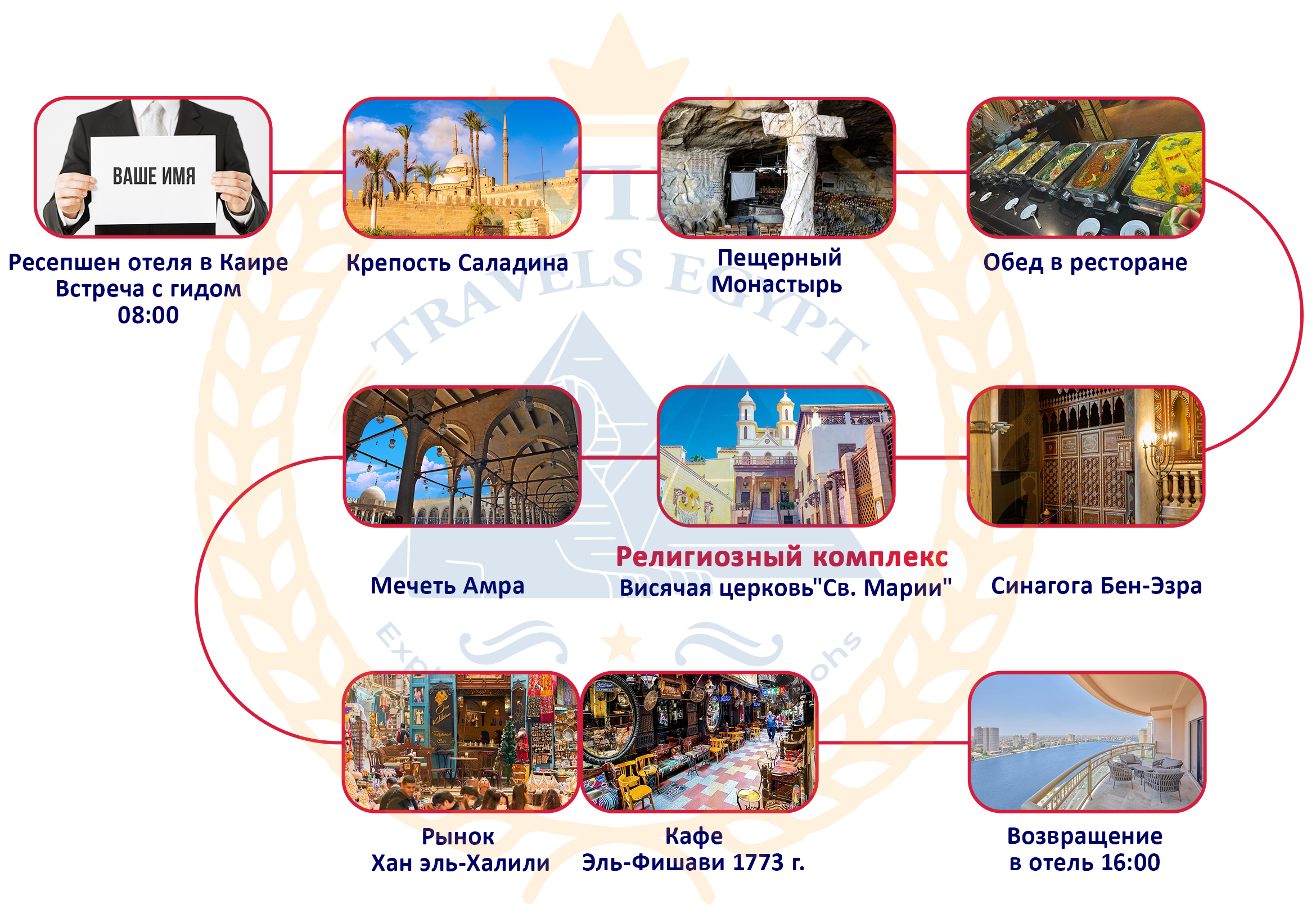 Религиозный комплекс в старом Каире — здесь, следуя за тремя Небесными религиями, посетим древнейшую мечеть не только Египта, но и всей Африки, украшенную культурной мозаикой старого Каира. Еще посетим одну из старейших сохранившихся синагог Египта — синагогу Бен Эзра, которая была построена в IV веке. Завершим знакомство с религиозным миром Египта в церкви Святой Девы Марии, где вы узнаете, почему этот храм называют Висячей церковью.
