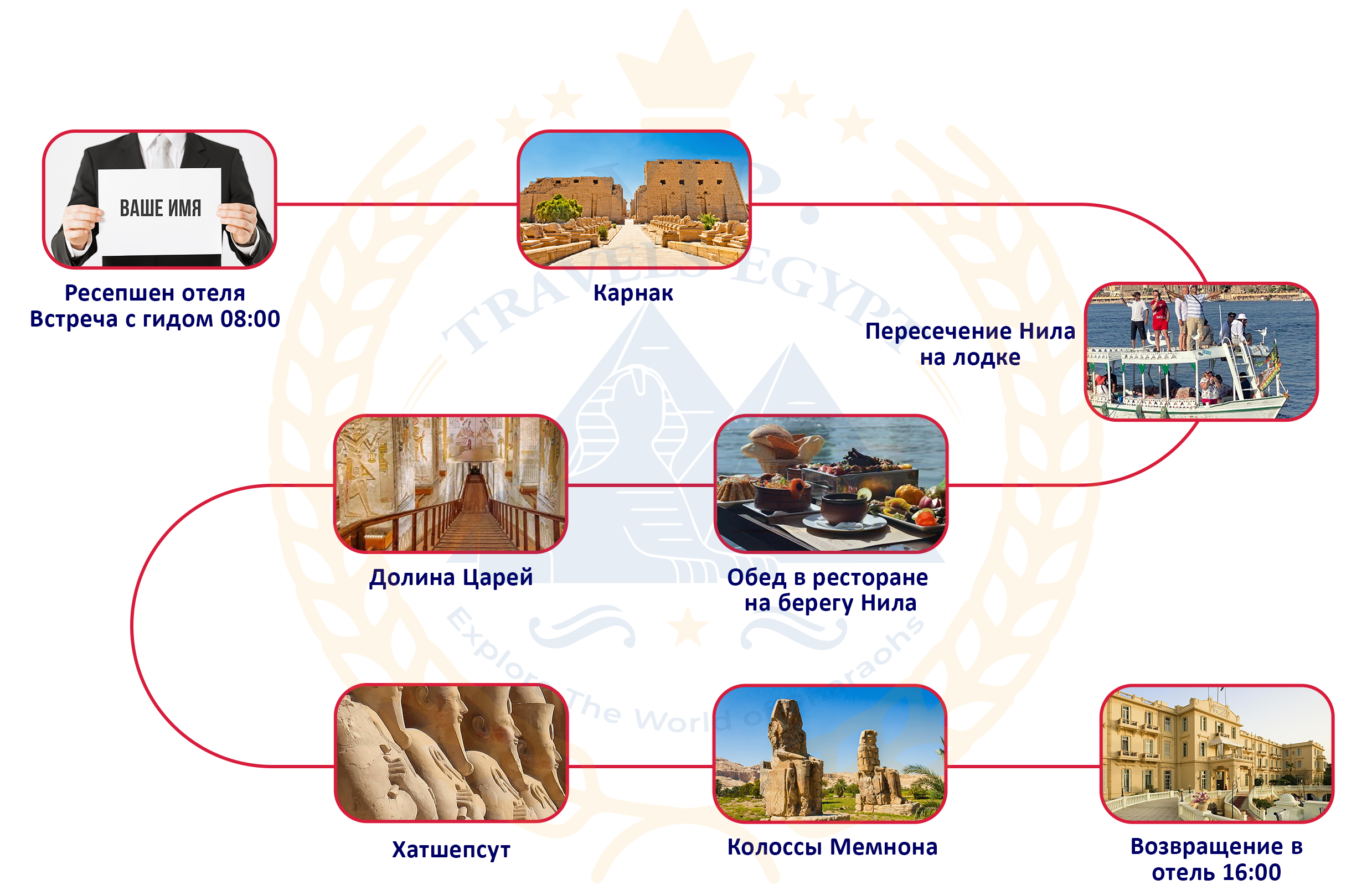 Во время экскурсии с нашим гидом вы осмотрите Карнакский комплекс и погрузитесь в один из интереснейших религиозно-мифологических миров человечества. Услышите о легендарных гробницах и колоссах Мемнона. А в конце отправитесь в путешествие по великому Нилу.