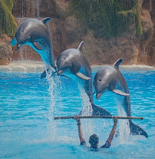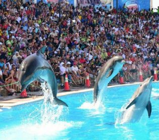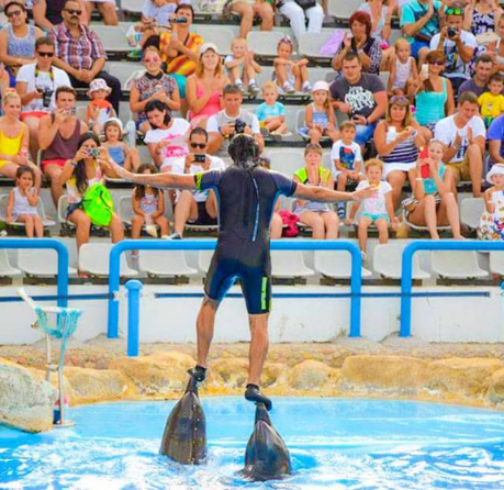 Вас ждёт увлекательное шоу дельфинов и морских котиков. Вы увидите, как дельфины виртуозно кидают и ловят обручи, прыгают через кольца, танцуют в паре с дрессировщиком, рисуют картины и поднимают столбы брызг, что особенно веселит детей. В завершение вам представится возможность исполнить мечту — поплавать с дельфином!.