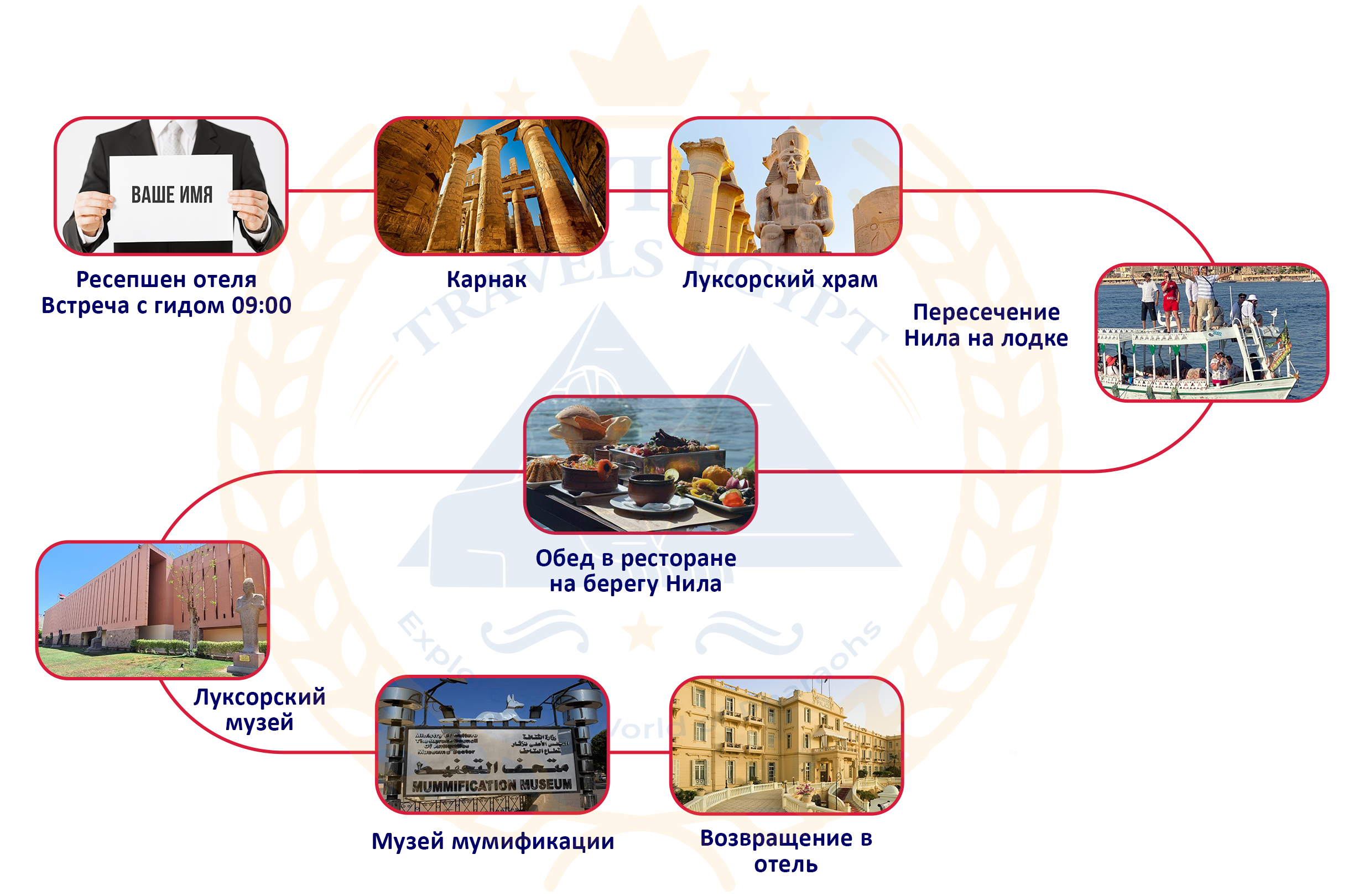 Во время экскурсии с нашим гидом вы осмотрите Карнакский комплекс и погрузитесь в один из интереснейших религиозно-мифологических миров человечества. Услышите о легендарных гробницах и колоссах Мемнона. А в конце отправитесь в путешествие по великому Нилу.