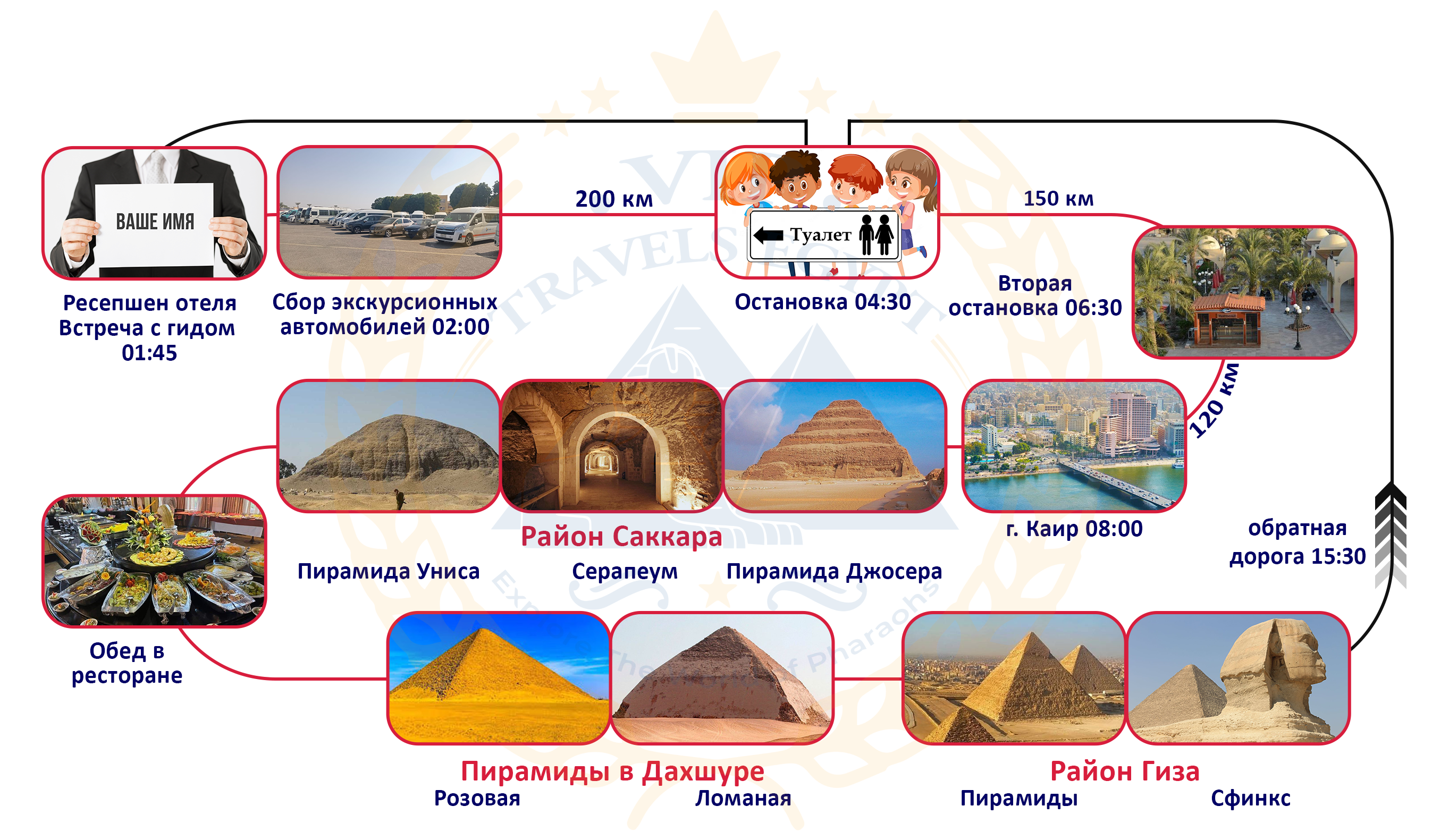 - Окончание экскурсии в Каире в 15:30. Возвращение в Шарм-эль-Шейх к 22:00. В отеле вас будет ждать поздний теплый ужин.