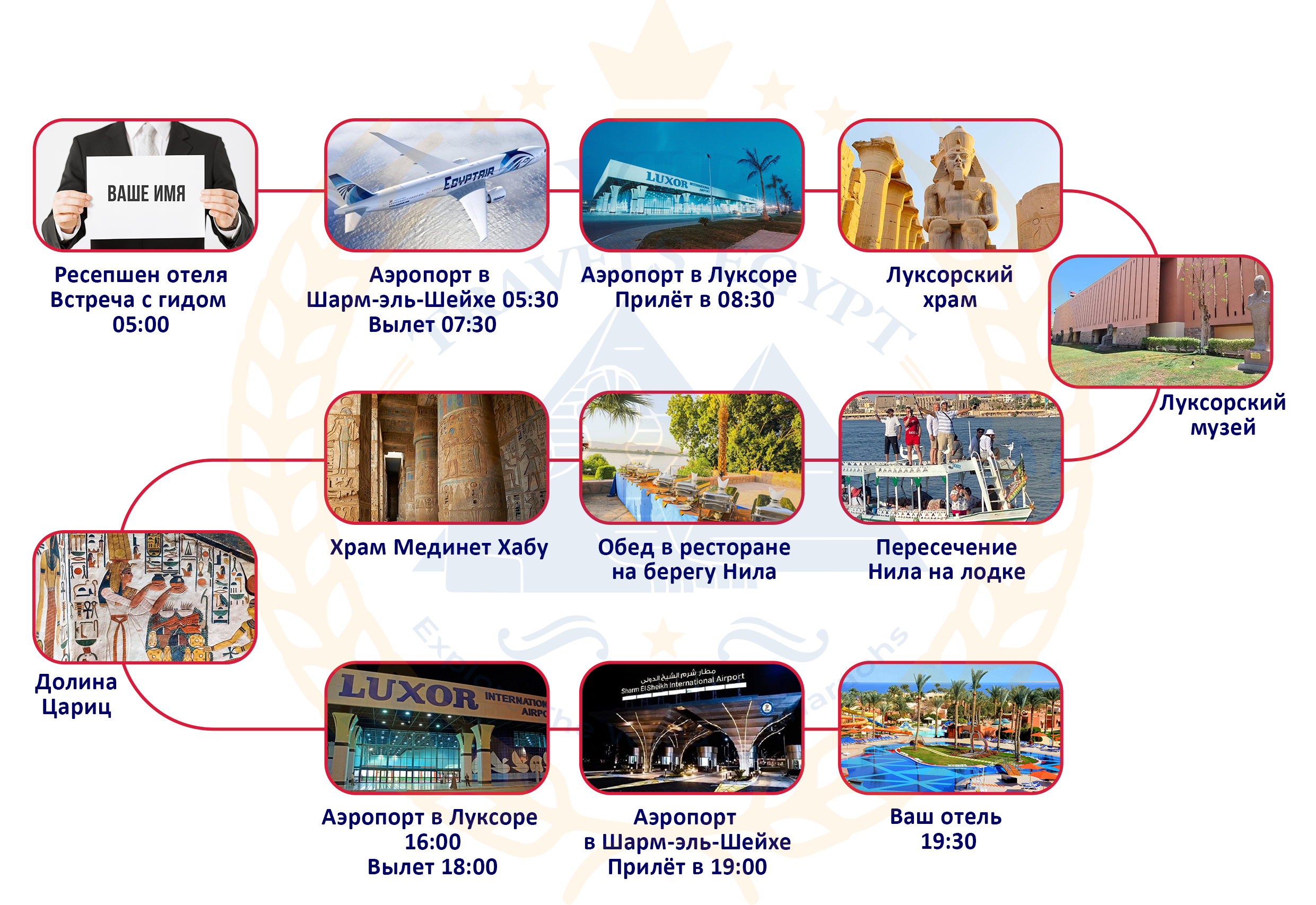 - Всего час полета — и вы в Луксорe. Там вас будет ждать профессиональный гид-египтолог, с которым вы проведете целый день, путешествуя на современном микроавтобусе с кондиционером. Вечером гид отвезет вас в аэропорт прямо к вашему рейсу. В Шарм-эль-Шейхe вас встретит представитель и доставит обратно в отель.