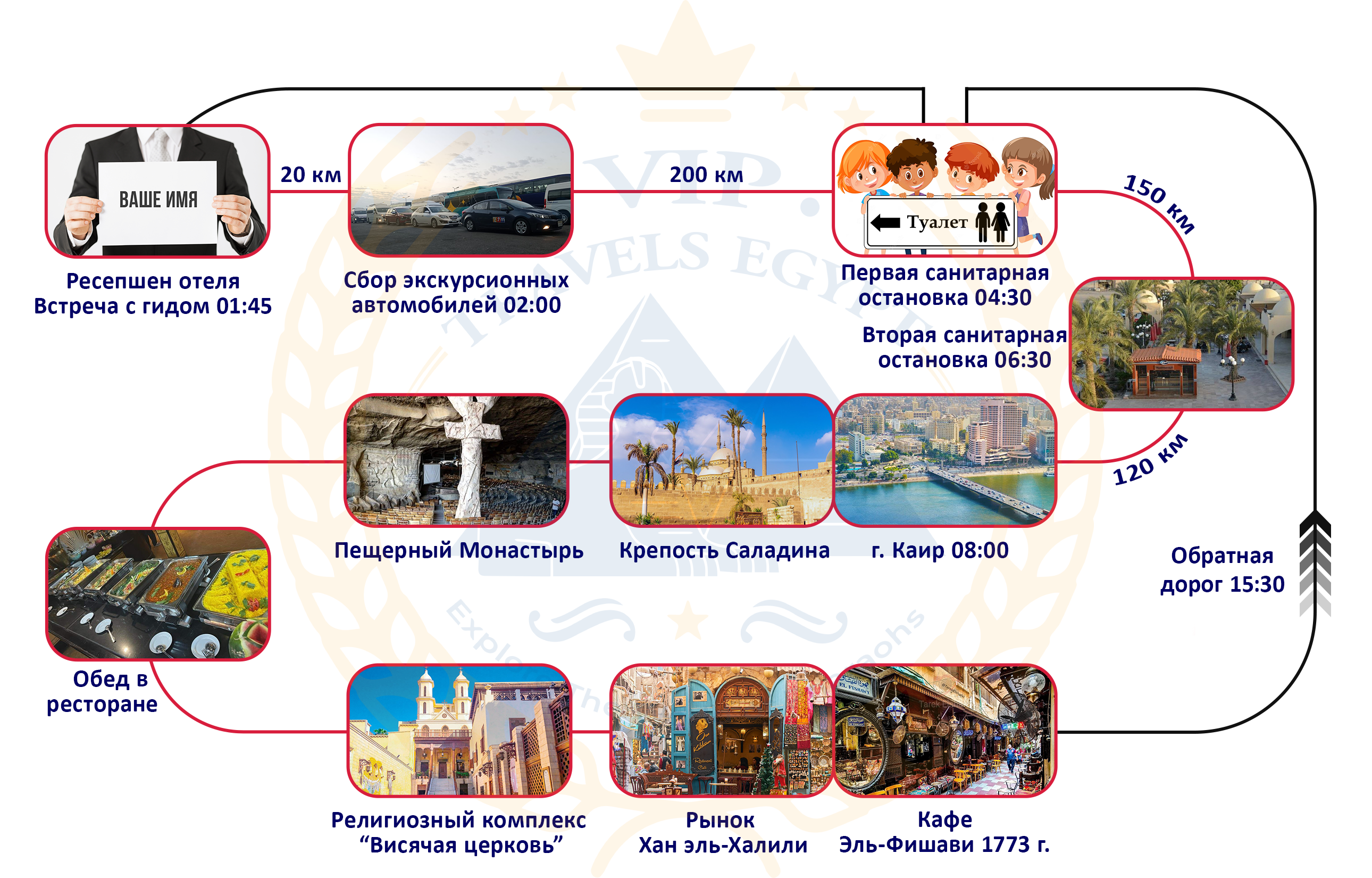 Экскурсии ведут профессиональные гиды-египтологи. Наша цель — сделать ваш отдых увлекательным и комфортным, познакомить с цивилизацией Египта, рассказать о культуре и истории наших великих предков. Вы ни секунды не потратите на походы по магазинам! Мы хотим, чтобы вы, приехав в Египет в следующий раз, снова выбрали нас и рекомендовали друзьям, поэтому на экскурсии будет только интересная и полезная информация, а еще комфортная и дружелюбная атмосфера