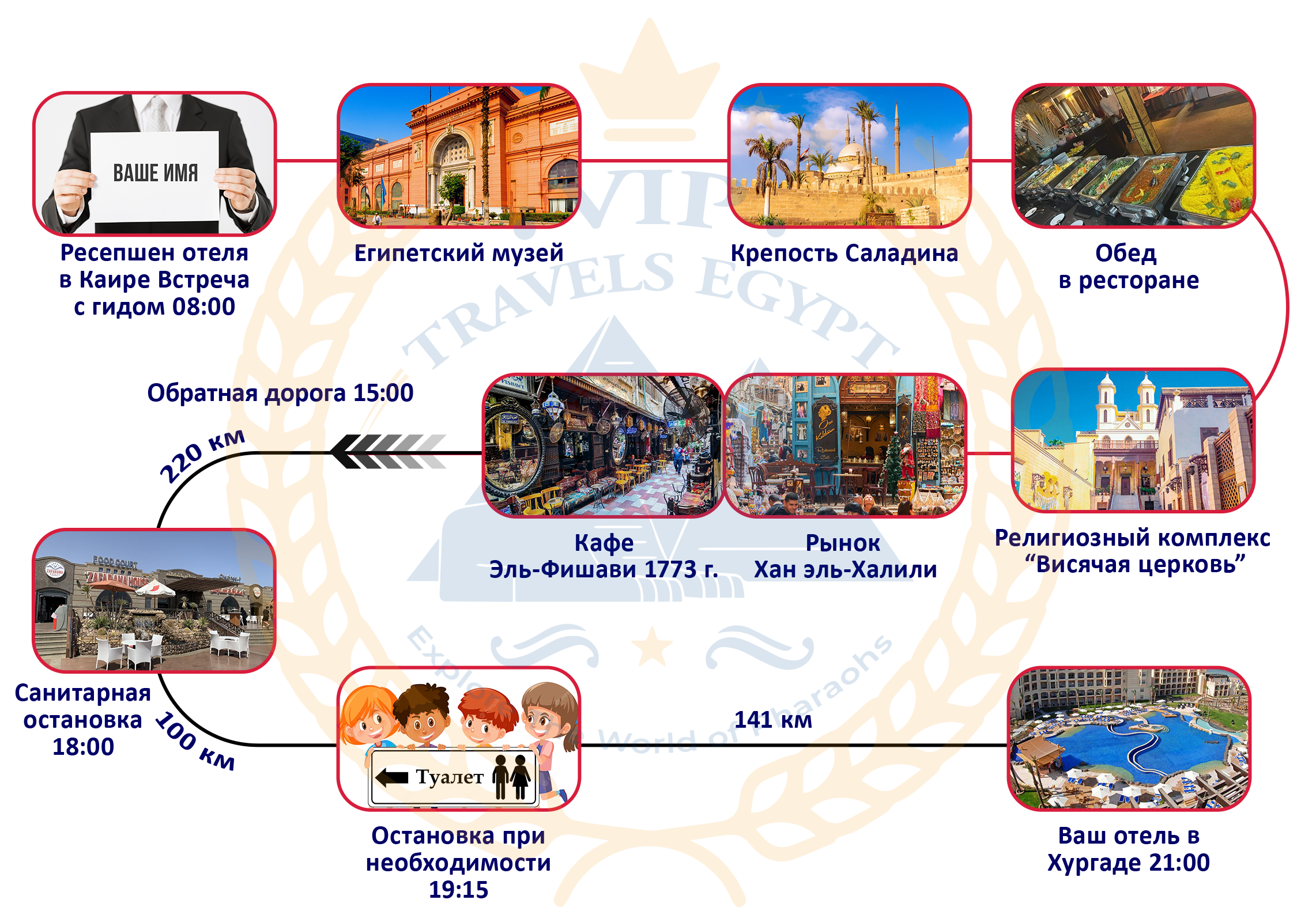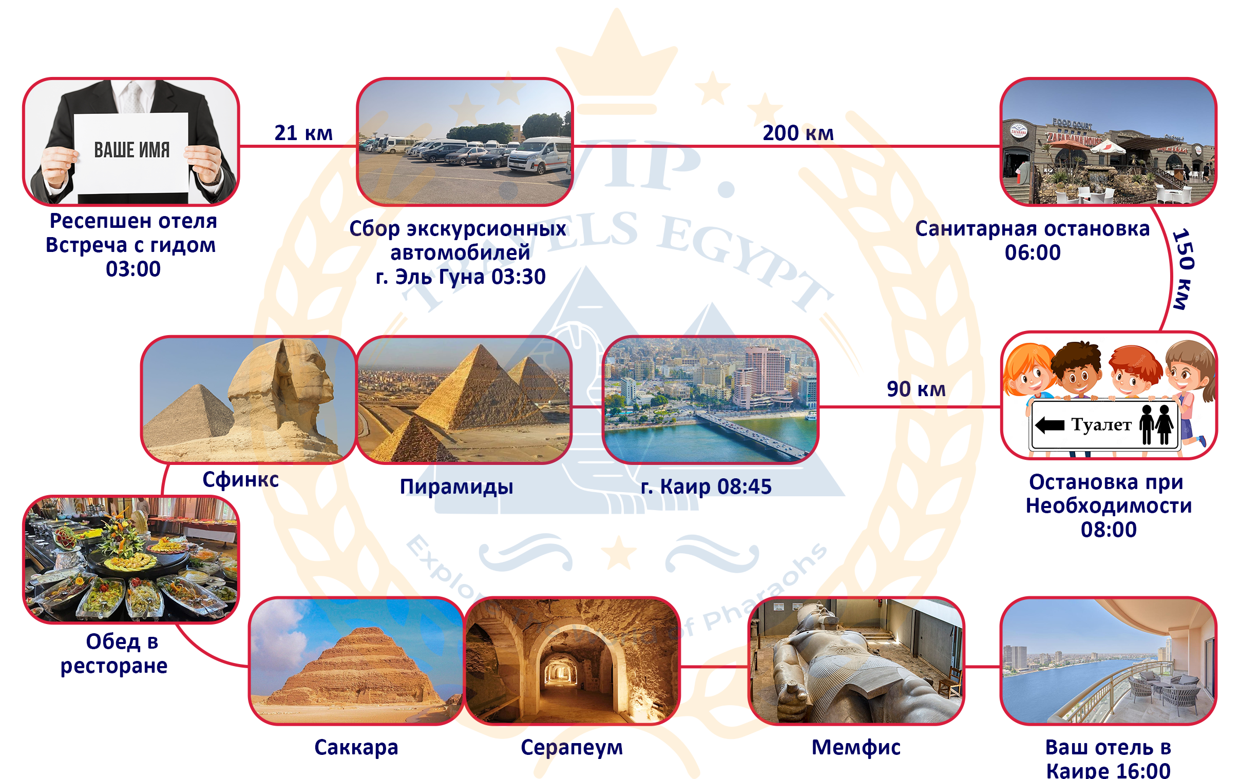 - Выезд в Каир в 03:00. Следующую ночь мы проведем в отеле. Вернемся в Хургаду на второй день к 21:00. Советуем заказать в отеле завтрак с собой, а также поздний ужин.