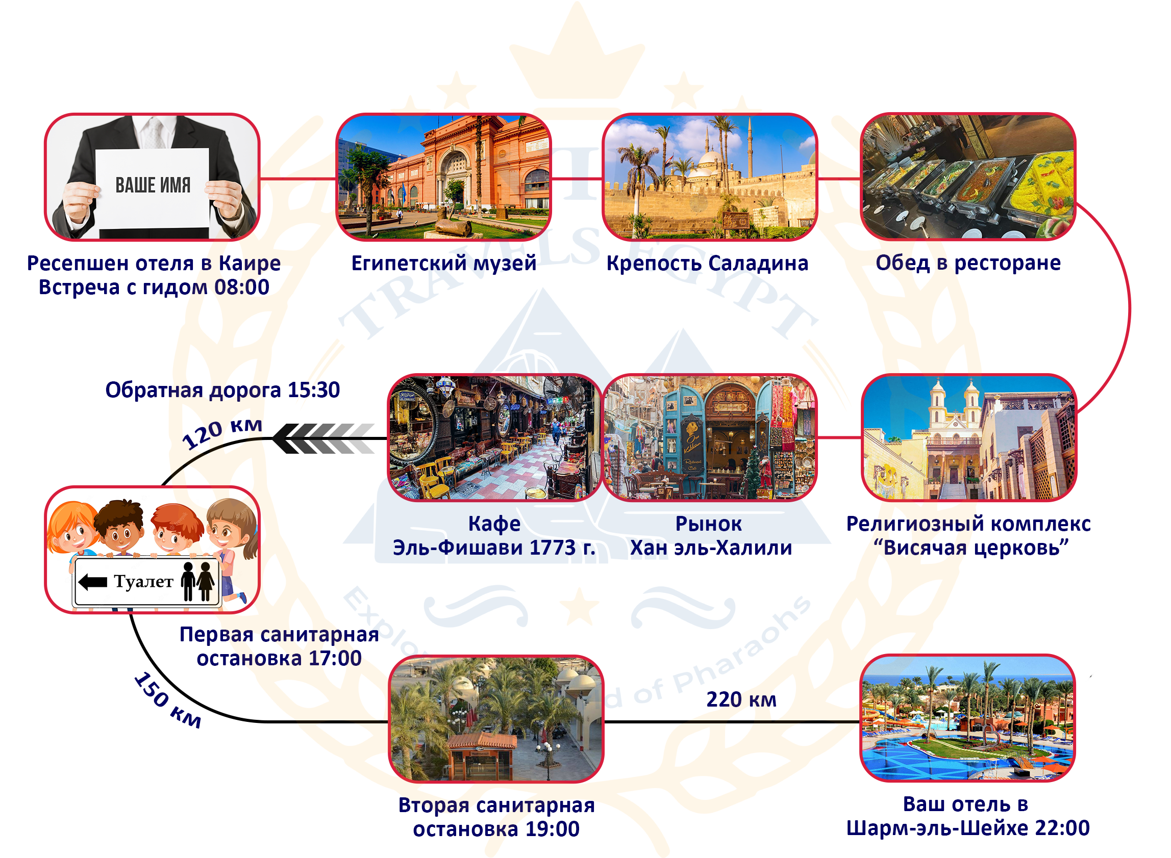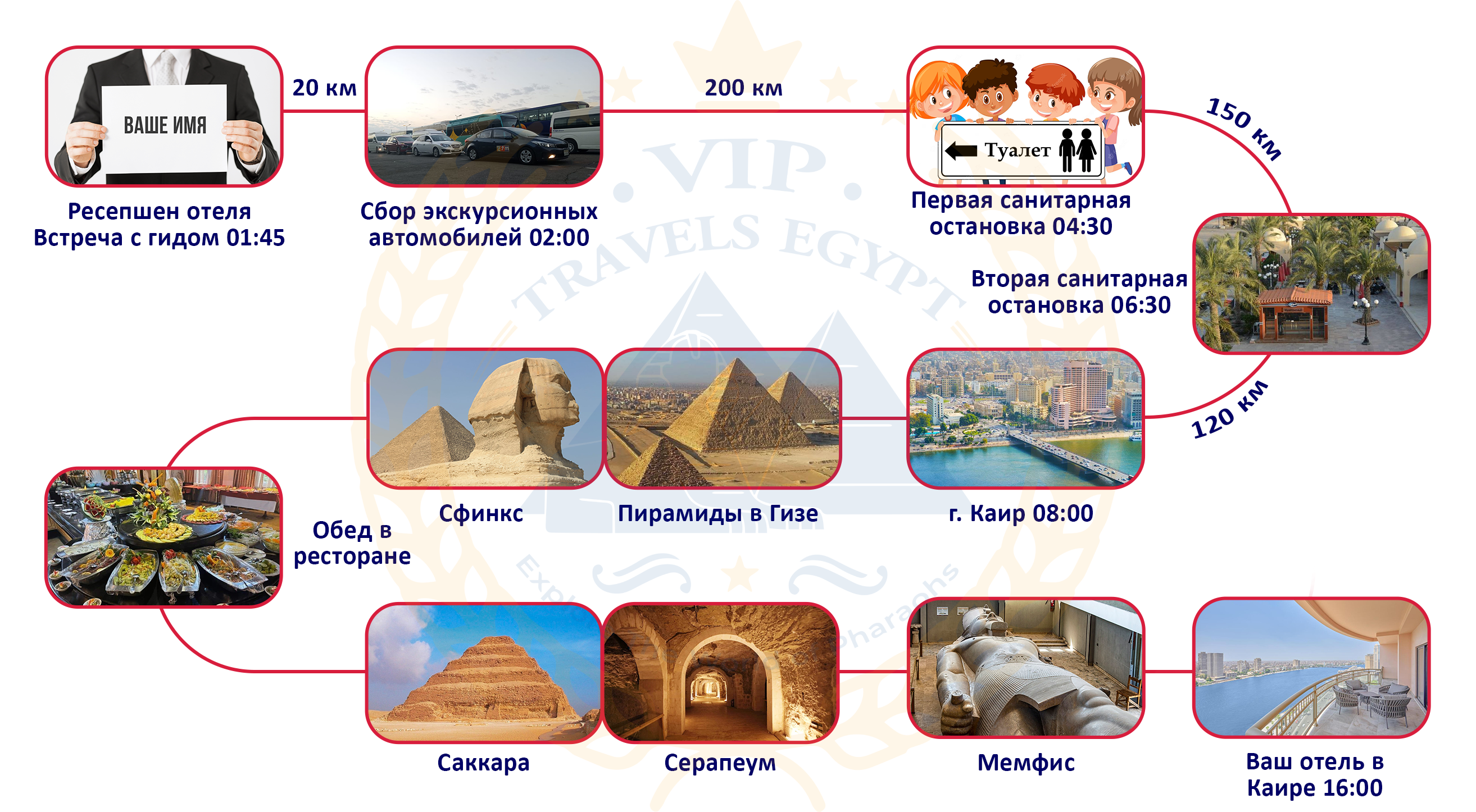 - Выезд в Каир в 02:00. Следующую ночь мы проведем в отеле. Вернемся в Шарм-эль-Шейх на второй день к 22:00. Советуем заказать в отеле завтрак с собой, а также поздний ужин