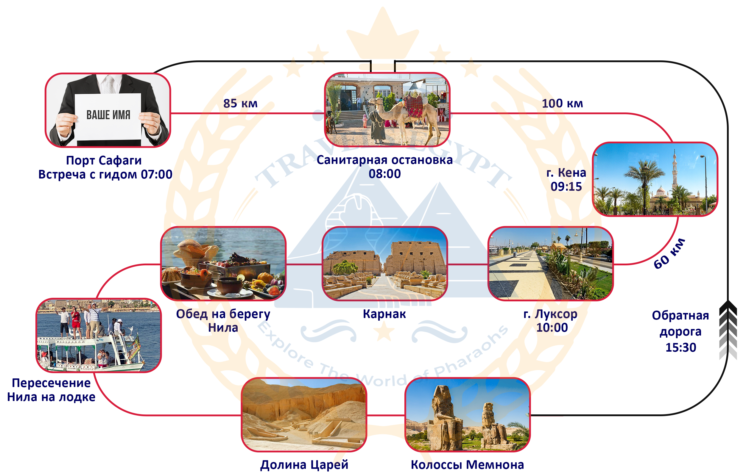 - Экскурсия в Луксоре заканчивается в 15:30. к 18:00 вы будете на лайнерe.