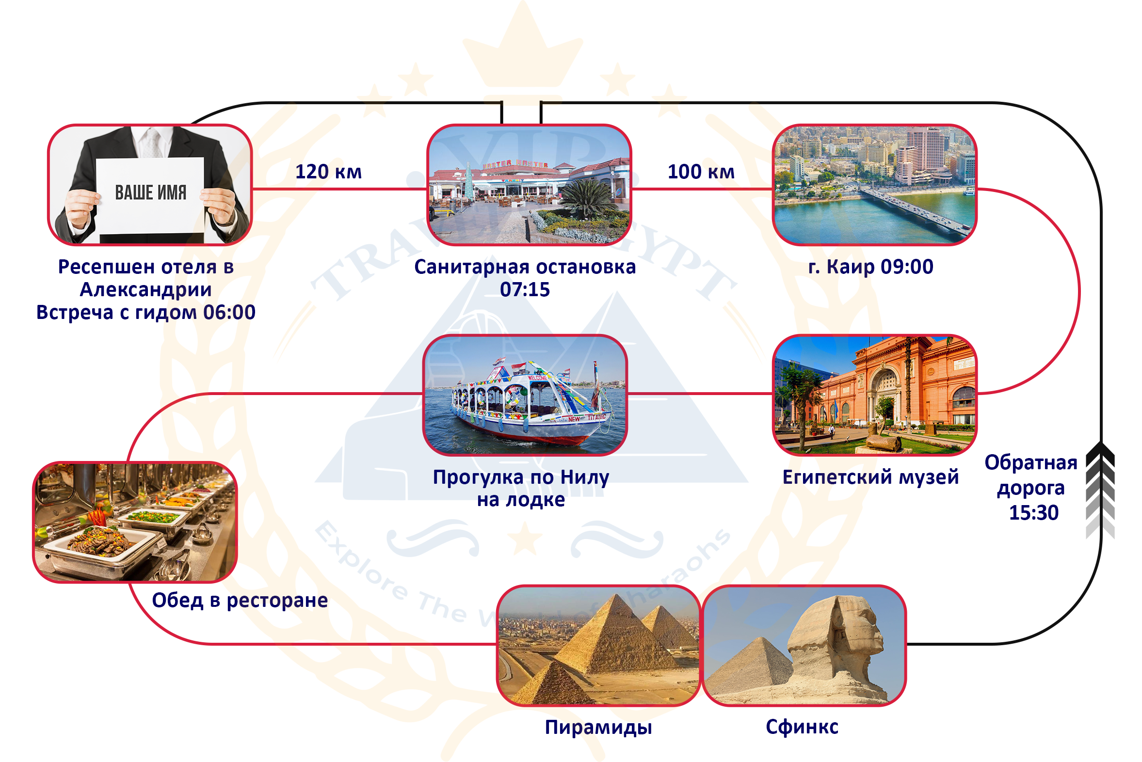 - Окончание экскурсии в Каире в 15:30. Возвращение в Александрию к 18:00.