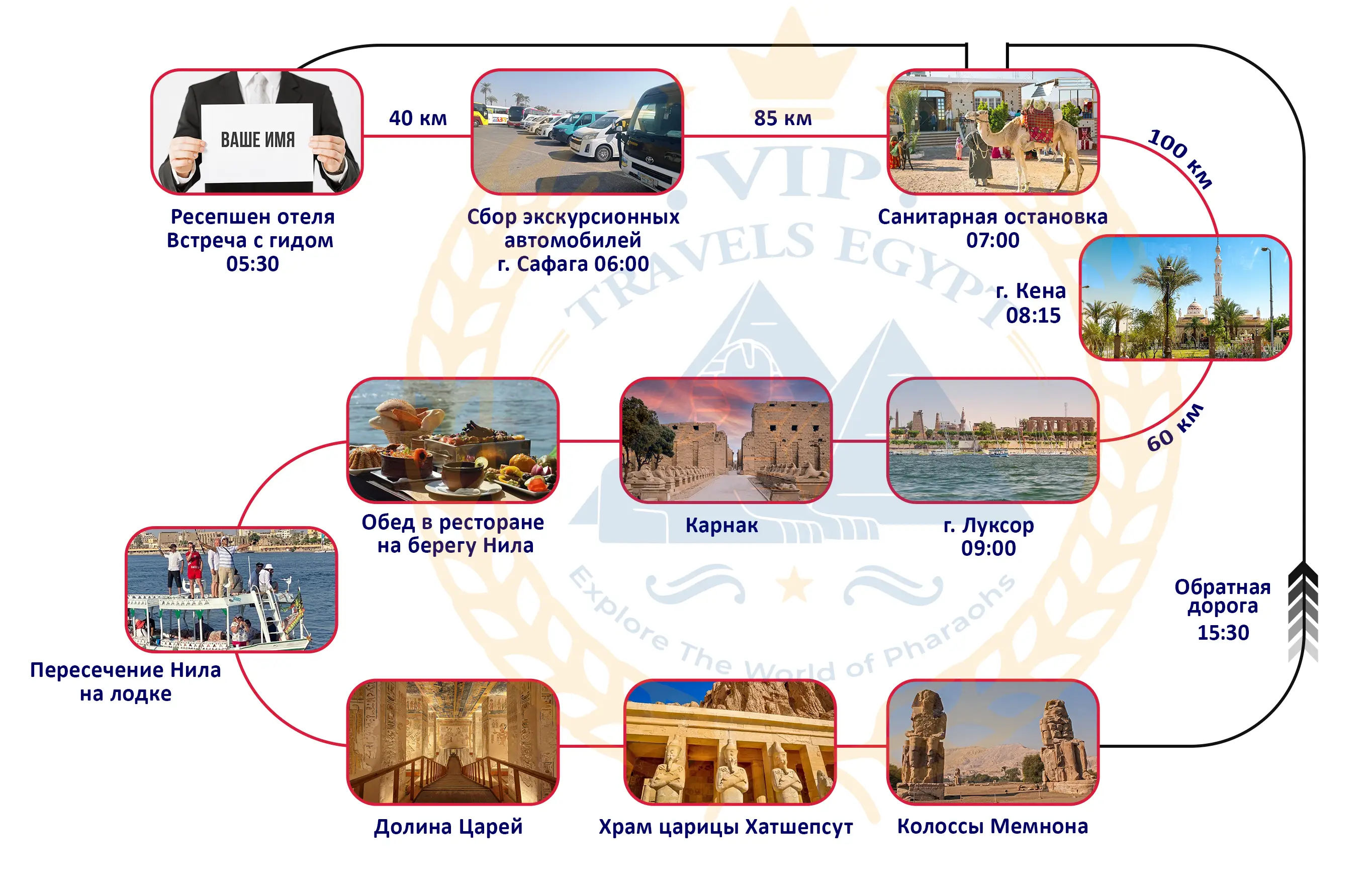 - Экскурсия в Луксоре заканчивается в 15:30. Возвращение в Хургаду к 18:30.